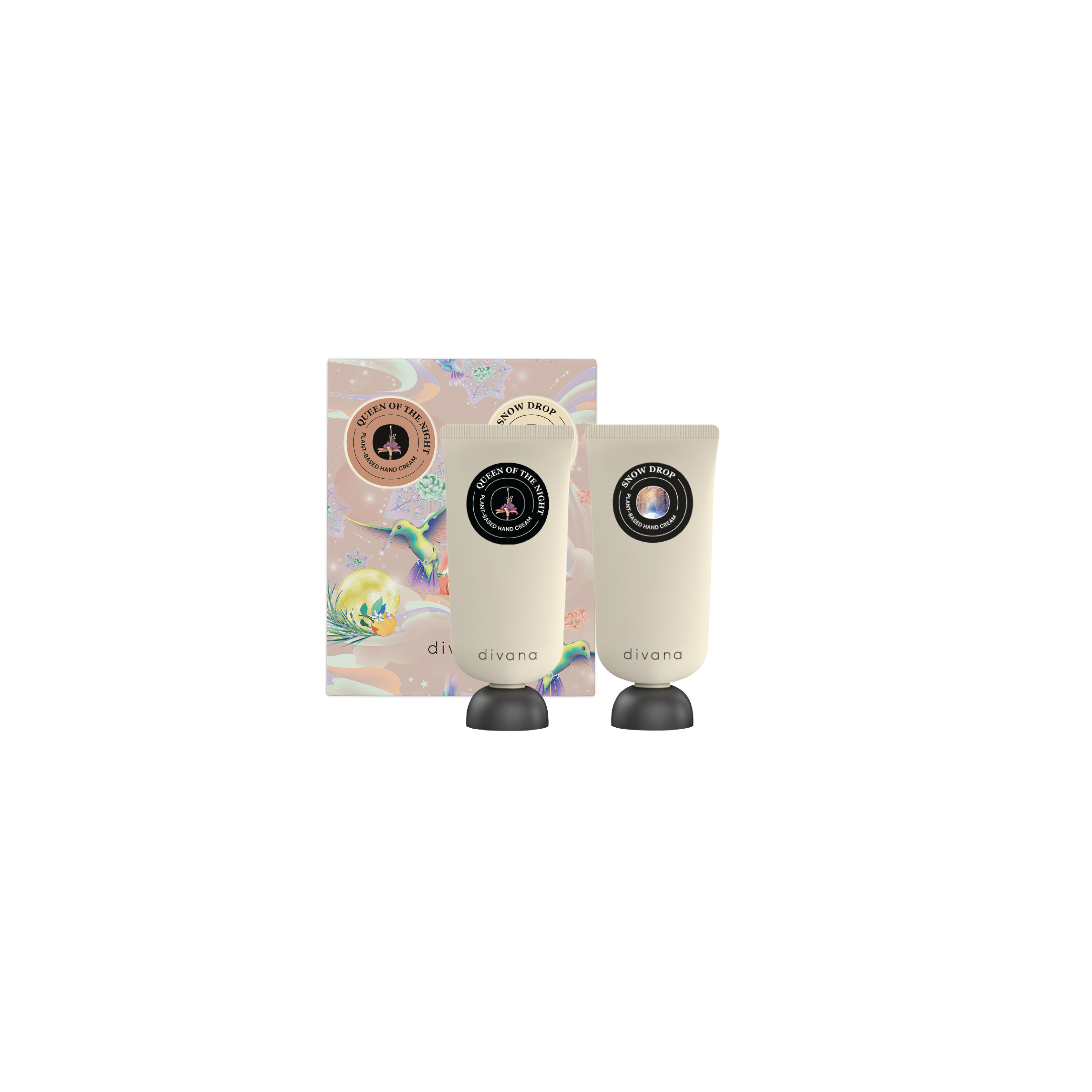 Divana Set Phenomenon Exotic Retreat Hand Cream 50g comes in three different scents: Sunrise, Full Moon, and Rainbow. Each scent offers unique benefits and a luxurious hand care experience.