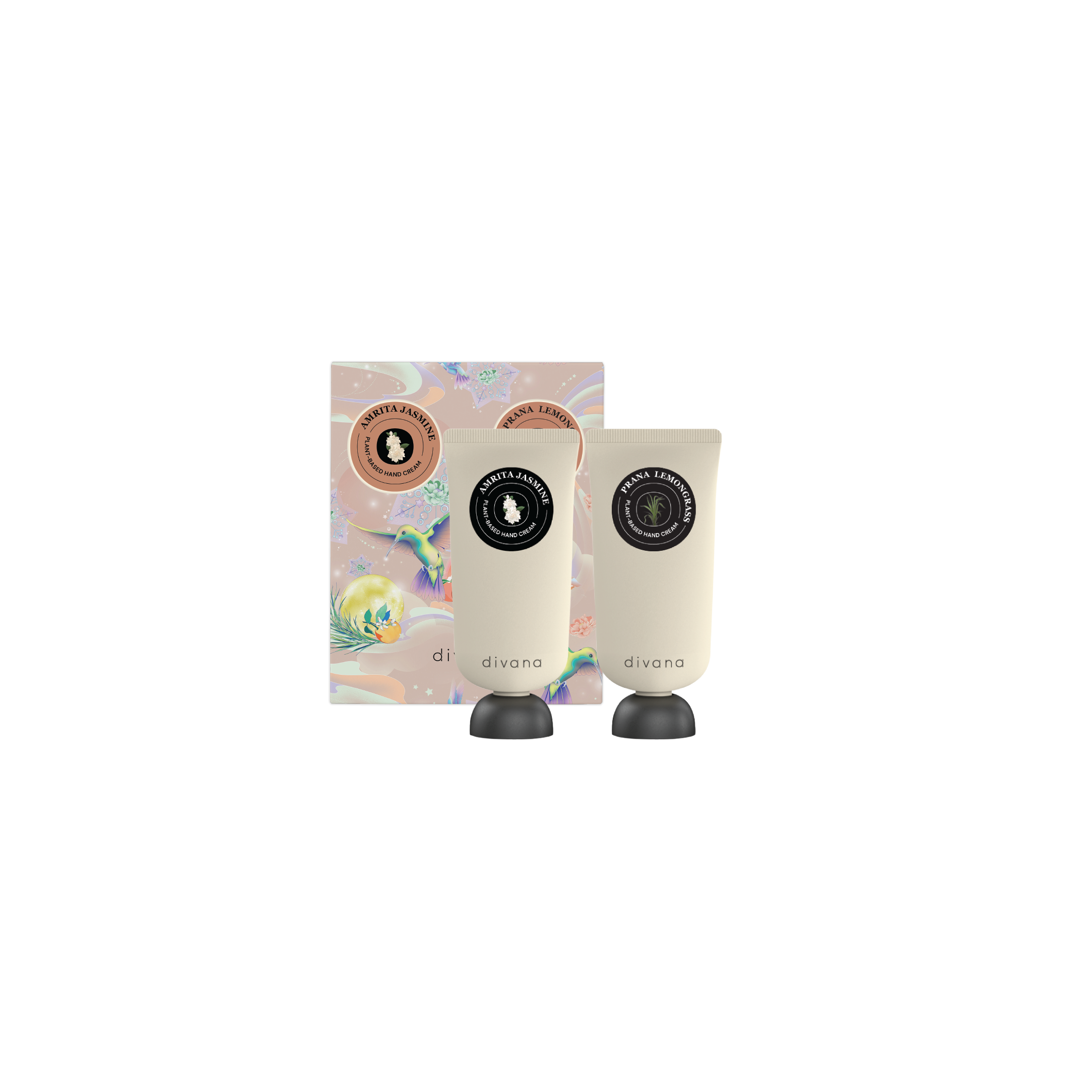 Divana Set Phenomenon Exotic Retreat Hand Cream 50g comes in three different scents: Sunrise, Full Moon, and Rainbow. Each scent offers unique benefits and a luxurious hand care experience.